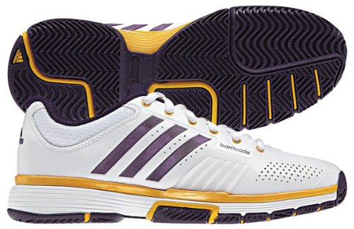 Adidas adiPower Barricade Team 2.0 Women's Tennis Shoe - White/Dark Violet/Still Gold Adidas latest version of the Barricade shoe has a new lighter weight seamless upper construction and an integrated forefoot flex-zone. Now approximately 1.06 oz. lighter with more forefoot flexibility. Lateral outrigger with adiPower Barricade claws which provides stability to help maintain quick cuts and fast footwork during extreme lateral movements and changes in direction. This shoe is equipped with a cavity for a micoach training system monitor.